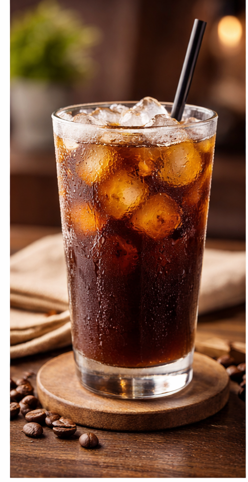 Café negro servido con hielo, refrescante y con un sabor intenso. Ideal para los amantes del café puro en días calurosos.